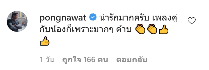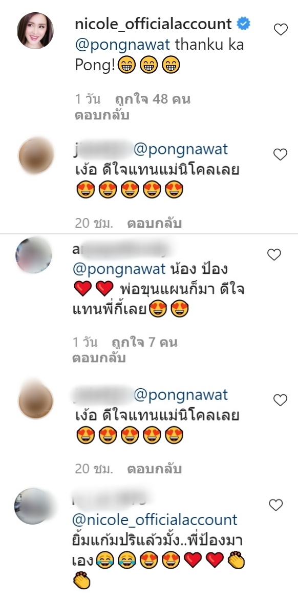 ในเวลาต่อมาพระเอกหนุ่มรูปหล่อ ป้อง ณวัฒน์ ก็ได้เข้ามาคอมเม้นในไอจีส่วนตัวของ นิโคล ว่า “น่ารักมากครับ เพลงคู่กับน้องก็เพราะมากๆ ค้าบ” ทำเอา นอโคล ถึงกลับตอบขอบคุณ ป้องณวัฒน์ อย่างเร็ว