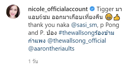 ได้มีการโพสต์ข้อความลงไอจีว่า “Tigger มาแอบ6ชม. ออกมาเกือบเที่ยงคืน thank you naka @sasi_sm, p Pong and P. ป่อง #thewallsongร้องข้ามกำแพง @thewallsong_official @aarontheriaults”