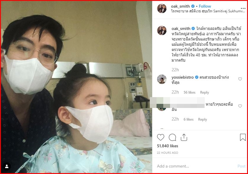 “ใกล้หายละครับ อลินเป็นไข้หวัดใหญ่สายพันธุ์เอ อาการไม่มากครับ น่าจะเพราะฉีดวัคซีนและรักษาเร็ว เด็กๆ หรือแม้แต่ผู้ใหญ่มีไข้ช่วงนี้ รีบพบแพทย์เพื่อตรวจหาไข้หวัดใหญ่กันนะครับ เพราะหากให้ยาได้เร็วใน 48 ชม. ทำให้อาการลดลงมากครับ”