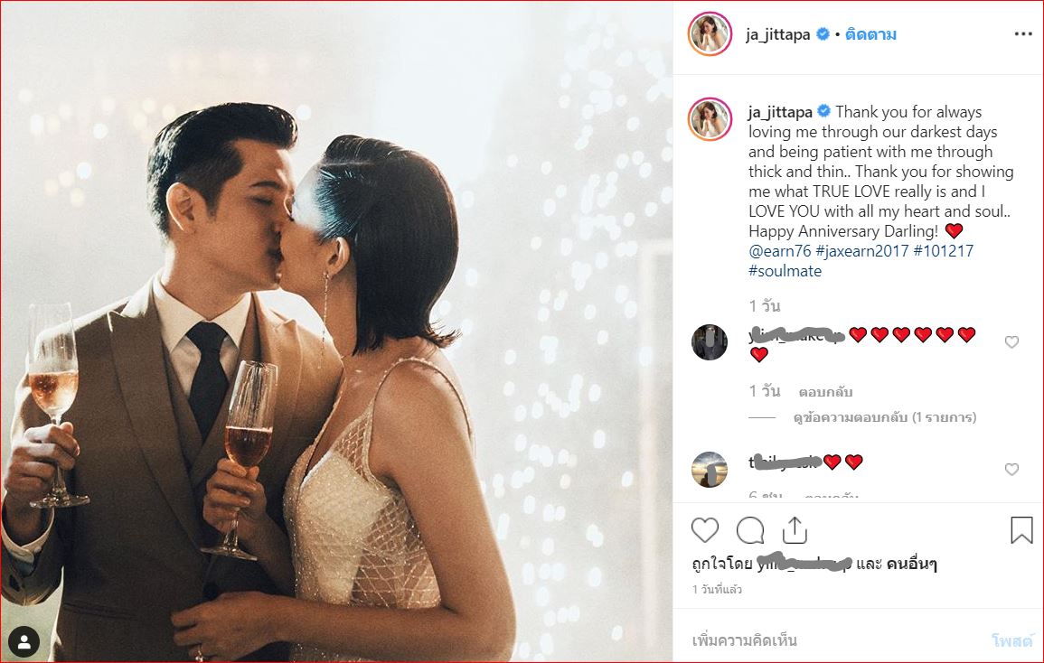 ล่าสุด เมื่อวันที่ 10 ธ.ค. ที่ผ่านมา เป็นวันครบรอบ 2 ปี ที่ทั้งคู่ ได้แต่งงานใช้ชีวิตร่วมกัน โดยสาวจ๊ะ ก็ได้เขียนข้อความบอกรักสุดซึ้ง ถึงผู้เป็นสามีว่า ” Thank you for always loving me through our darkest days and being patient with me through thick and thin.. Thank you for showing me what TRUE LOVE really is and I LOVE YOU with all my heart and soul.. Happy Anniversary Darling! @earn76 #jaxearn2017 #101217 #soulmate”