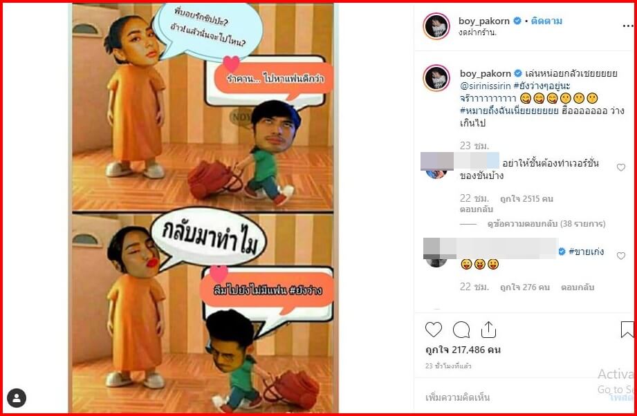 ความสัมพันธ์เป็นที่จับตามองสำหรับ บอย ปกรณ์ และ ชิปปี้ ศิรินทร์ หลังจากพักหลังที่สาวชิปปี้เลิกกับ อองตวน ทั้งคู่ก็ดูสนิมสนมกันมาก แถมคำพูดคำจาที่นางคุยกันก็ชวนฟินชวนจิ้น แถมได้ข่าวมาว่าตอนนี้สาวชิปปี้ผ่านด่านน้องวันใหม่แล้วนะ เพียงเพราะว่าสาวชิปปี้สวยน้องวันใหม่ก็เลยเปิดทางให้ ล่าสุดหนุ่มบอยทำเอาเเฟนๆลุ้นอีกแล้ว เพราะนางได้โพสต์ภาพที่ตอนนี้ชาวเน็ตกำลังฮิตเล่นกัน ตัดต่อหน้าหนุ่มบอยกับสาวชิปปี้เข้าไป