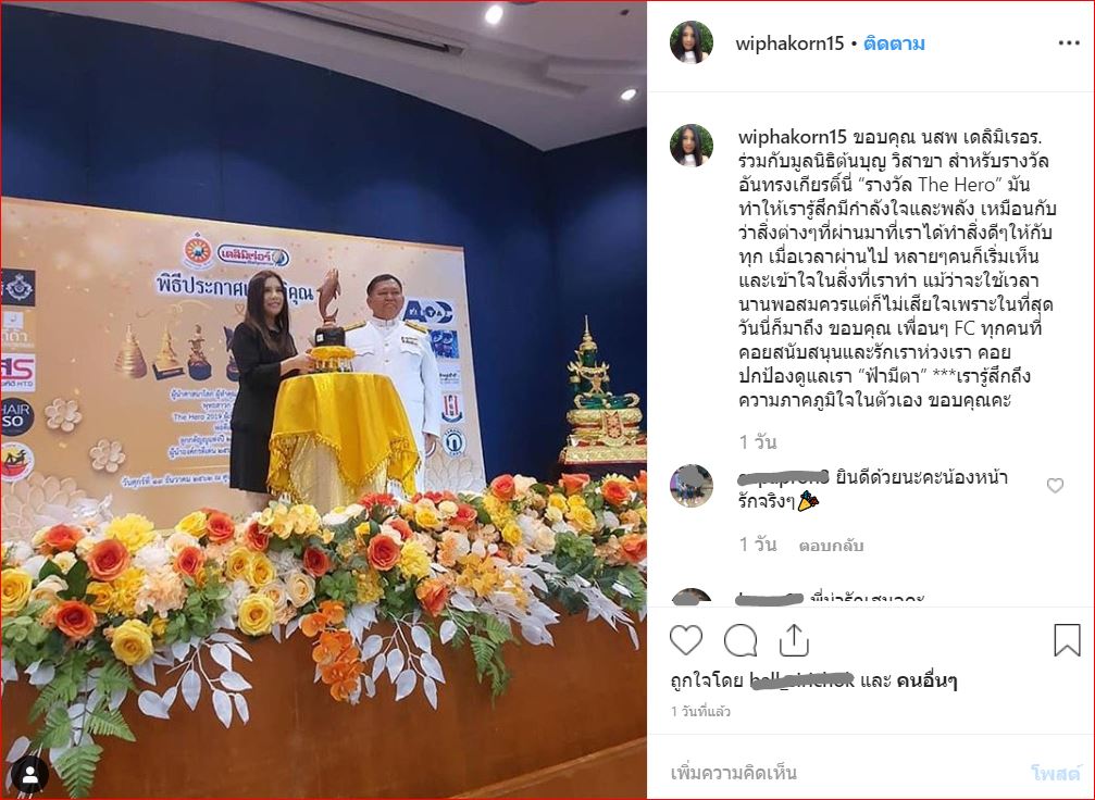 โดยสาวการต์ได้ออกมาโพสต์ ig ด้วยความปลื้มใจที่ได้รางวัลว่า “ขอบคุณ นสพ.เดลิมิเรอร์ ร่วมกับมูลนิธิต้นบุญ วิสาขา สำหรับรางวัลอันทรงเกียรตินี้ “รางวัล The Hero” มันทำให้เรารู้สึกมีกำลังใจและพลัง เหมือนกับว่าสิ่งต่าง ๆ ที่ผ่านมาที่เราได้ทำสิ่งดี ๆ ให้กับทุก เมื่อเวลาผ่านไป หลาย ๆ คนก็เริ่มเห็นและเข้าใจในสิ่งที่เราทำ แม้ว่าจะใช้เวลานานพอสมควรแต่ก็ไม่เสียใจ เพราะในที่สุดวันนี้ก็มาถึง ขอบคุณ เพื่อน ๆ FC ทุกคนที่คอยสนับสนุนและรักเราห่วงเรา คอยปกป้องดูแลเรา “ฟ้ามีตา” ***เรารู้สึกถึงความภาคภูมิใจในตัวเอง ขอบคุณค่ะ”
