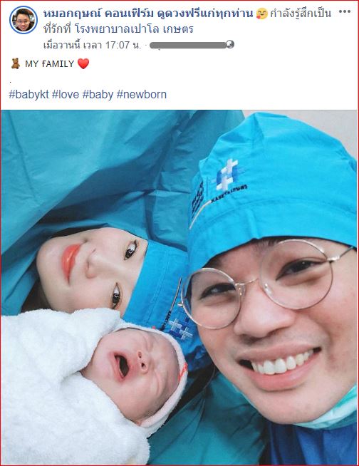 ซึ่งระบุข้อความว่า “ลูกชายผมคลอดแล้วครับ น้องเคที ศุภฤกษ์ ปทุมศรีวิโรจน์ รู้สึกตื่นเต้นมากๆดีใจสุดๆเลยครับ ขอทุกท่านช่วยอวยพรให้กับลูกคนแรกของผมเพื่อเป็นศิริมงคลแก่ผมและลูกผมด้วยครับ ขอบคุณครับ”