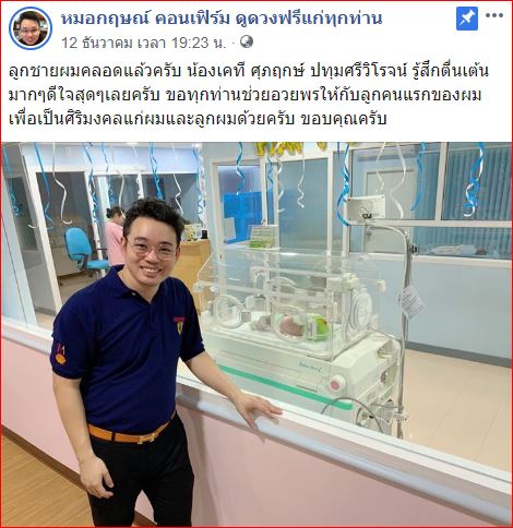 ในที่สุดก็มีทายาทตัวน้อยๆสักทีสำรหับ “หมอกฤษณ์ คอนเฟิร์ม” หรือ “ศุกฤษณ์ ปทุมศรีวิโรจน์” เมื่อวันที่ 12 ธันวาคม 2562 ช่วงเวลาประมาน 19.23 น. ได้ออกมาโพสต์ภาพลูกชายเพิ่งคลอด