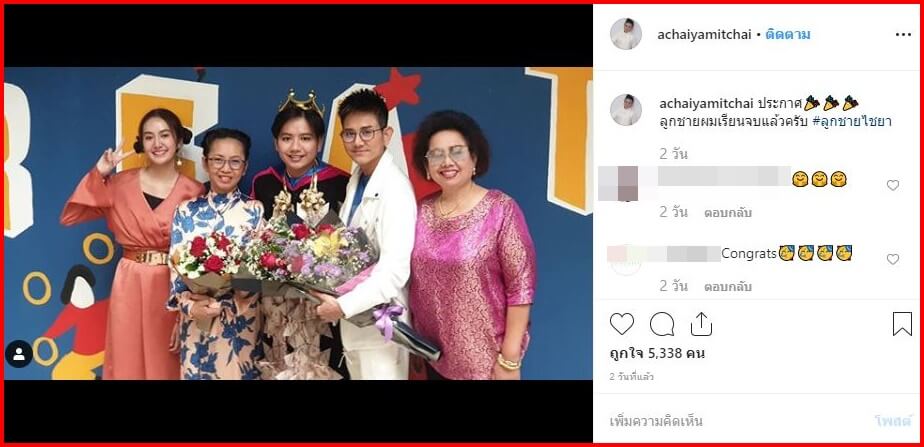 ส่วนลูกๆก็โตเป็นหนุ่มเป็นสาวกันหมดเเล้ว น้องแป้ง ลูกสาวคนโต เรียนจบเป็นที่เรียบร้อย ซึ่งดูเเววเเล้วก็น่าจะเดินตามรอยคุณพ่อเข้าวงการบันเทิง ส่วน น้องเเชมป์ ลูกชายคนเล็ก เพิ่งเรียนจบไปสดๆร้อนๆ ทำเอาคุณพ่อนี่ปลื้มสุดๆ โดยหนุ่มเอได้โพสต์ภาพพร้อมเเคปชั่นว่า “ประกาศ ลูกชายผมเรียนจบแล้วครับ #ลูกชายไชยา” ทางทีมงานต้องขอแสดงความยินดีด้วยอีกครั้งนะคะ