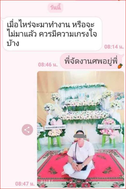 เมื่อวันที่ 16 ธันวาคม 2562 เพจ แรงงานเพื่อสังคม ได้โพสต์ข้อความสะเทือนใจคนหาเช้ากินค่ำที่ลางานมางานศพญาติแต่ทางหัวหน้างานทักมาถามว่าเมื่อไหร่จะมาทำงานหรือจะไม่มาแล้วควรมีความเกรงใจกันบ้าง ซึ่งสาวคนดังกล่าวตอบกลับไปว่าจัดงานศพอยู่พี่