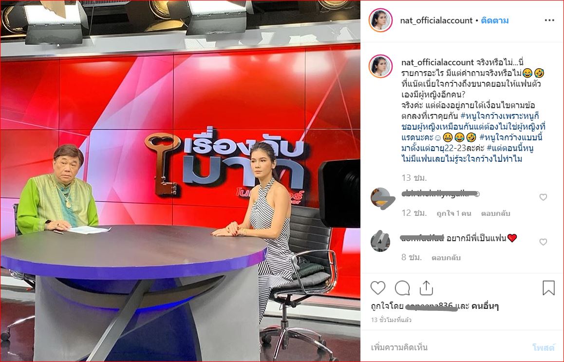 ซึ่งระบุว่า “จริงหรือไม่…นี่รายการอะไร มีแต่คำถามจริงหรือไม่ ที่แน๊ตเนี่ยใจกว้างถึงขนาดยอมให้แฟนตัวเองมีผู้หญิงอีกคน? จริงค่ะ แต่ต้องอยู่ภายใต้เงื่อนไขตามข้อตกลงที่เราคุยกัน #หนูใจกว้างเพราะหนูก็ชอบผู้หญิงเหมือนกันแต่ต้องไม่ใช่ผู้หญิงที่แรดนะคะ #หนูใจกว้างแบบนี้มาตั้งแต่อายุ22-23ละค่ะ #แต่ตอนนี้หนูไม่มีแฟนเลยไม่รู้จะใจกว้างไปทำไม”