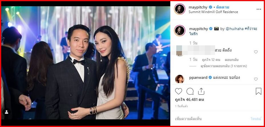 ล่าสุดสาวเมย์ได้โพสต์ภาพคู่ไฮโซบิ๊กแบบเเนบชิดพร้อมติดแฮชแท็ค #ก็ว่าจะไม่รัก งานนี้เพื่อนซี้อย่าง เป้ย ปานวาด ไม่รอช้ารีบเข้ามาคอมเม้นท์เพื่อนสาวว่า “แต่งเหอะ ขอร้อง”  อ้าว!!เพื่อนๆเชียร์กันเบอร์นี้ ก็ต้องสนองความต้องการเพื่อนกันหน่อย