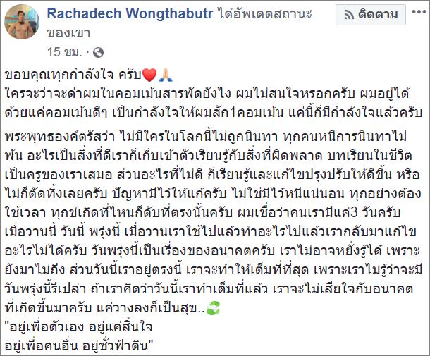 “ขอบคุณทุกกำลังใจ ครับ ใครจะว่าจะด่าผมในคอมเมนต์สารพัดยังไง ผมไม่สนใจหรอกครับ ผมอยู่ได้ด้วยแค่คอมเมนต์ดีๆ เป็นกำลังใจให้ผมสัก 1 คอมเมนต์ แค่นี้ก็มีกำลังใจแล้วครับ พระพุทธองค์ตรัสว่า ไม่มีใครในโลกนี้ไม่ถูกนินทา ทุกคนหนีการนินทาไม่พ้น อะไรเป็นสิ่งที่ดีเราก็เก็บเข้าตัวเรียนรู้กับสิ่งที่ผิดพลาด บทเรียนในชีวิตเป็นครูของเราเสมอ ส่วนอะไรที่ไม่ดี ก็เรียนรู้และแก้ไขปรุงปรับให้ดีขึ้น หรือไม่ก็ตัดทิ้งเลยครับ ปัญหามีไว้ให้แก้ครับ ไม่ใช่มีไว้หนีแน่นอน ทุกอย่างต้องใช้เวลา ทุกข์เกิดที่ไหนก็ดับที่ตรงนั้นครับ ผมเชื่อว่าคนเรามีแค่3 วันครับ เมื่อวานนี้ วันนี้ พรุ่งนี้ เมื่อวานเราใช้ไปแล้วทำอะไรไปแล้วเรากลับมาแก้ไขอะไรไม่ได้ครับ วันพรุ่งนี้เป็นเรื่องของอนาคตครับ เราไม่อาจหยั่งรู้ได้ เพราะยังมาไม่ถึง ส่วนวันนี้เราอยู่ตรงนี้ เราจะทำให้เต็มที่ที่สุด เพราะเราไม่รู้ว่าจะมีวันพรุ่งนี้รึเปล่า ถ้าเราคิดว่าวันนี้เราทำเต็มที่แล้ว เราจะไม่เสียใจกับอนาคตที่เกิดขึ้นมาครับ แค่วางลงก็เป็นสุข..”อยู่เพื่อตัวเอง อยู่แค่สิ้นใจ อยู่เพื่อคนอื่น อยู่ชั่วฟ้าดิน”