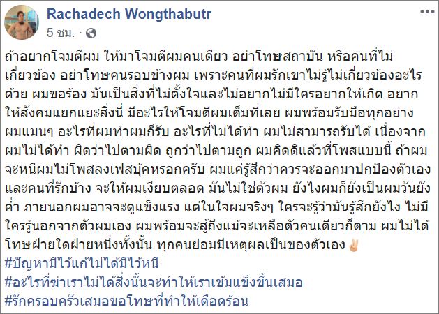 ผู้ใช้เฟซบุ๊ก “Rachadech Wongthabutr” หรือ นายรัชเดช วงศ์ทะบุตร ออกมาโพสต์ผ่านเฟซบุ๊กส่วนตัวหลังได้รับประกันตัว โดยระบุข้อความว่า