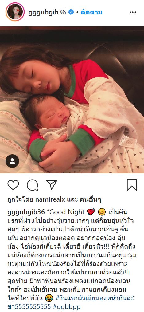 ระบุเเคปชั่นว่า*Good Night เป็นคืนแรกที่ผ่านไปอย่างวุ่นวายมากๆ แต่ก็อบอุ่นหัวใจสุดๆ พี่สาวอย่างเป่าเปาคือน่ารักมากเอ็นดู ตื่นเต้น อยากดูแลน้องตลอด อยากกอดน้อง อุ้มน้อง ไอ้น้องก็เดี๋ยวฉี่ เดี๋ยวอึ เดี๋ยวหิว!!! พี่ก็คิดถึงแม่น้องก็ต้องการแม่กลายเป็นเกาะแม่กันอยู่มะรุมมะตุมแม่กันใหญ่น้องร้องไอ้พี่ก็ร้องด้วยเพราะสงสารน้องและก็อยากให้แม่มานอนด้วยแล้ว!!! สุดท้าย ป๊าพาพี่นอนร้องเพลงแม่กอดน้องนอนใกล้ๆ อะเป็นอันจบ พอหลับพาแยกเตียงนอนได้ที่ใครที่มัน  #วันแรกผัวเมียมองหน้ากันละขำ5555555555 #ggbbpp