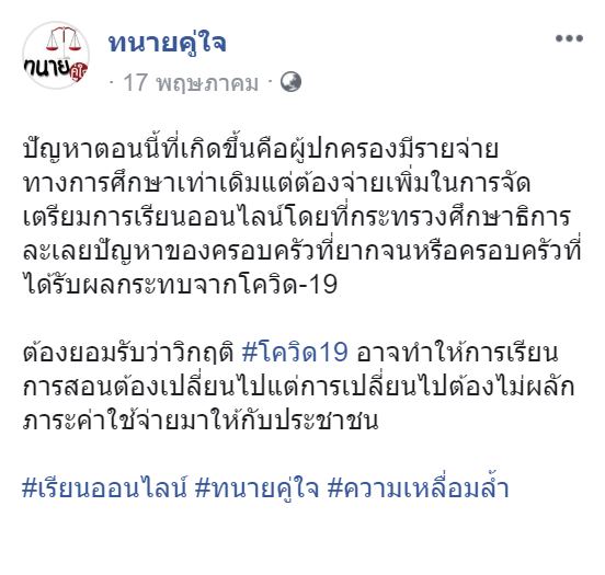 โดยทางเพจ ทนายคู่ใจ ได้ออกมาพูดถึงเรื่องนี้ว่า ทางการศึกษาเท่าเดิมแต่ต้องจ่ายเพิ่มในการจัดเตรียมการเรียนออนไลน์โดยที่กระทรวงศึกษาธิการละเลยปัญหาของครอบครัวที่ยากจนหรือครอบครัวที่ได้รับผลกระทบจากCV-19 ต้องยอมรับว่าวิกฤติ #CV19 อาจทำให้การเรียนการสอนต้องเปลี่ยนไปแต่การเปลี่ยนไปต้องไม่ผลักภาระค่าใช้จ่ายมาให้กับประชาชน และยังทิ้งแฮสแท็กไว้ว่า #เรียนออนไลน์ #ทนายคู่ใจ #ความเหลื่อมล้ำ