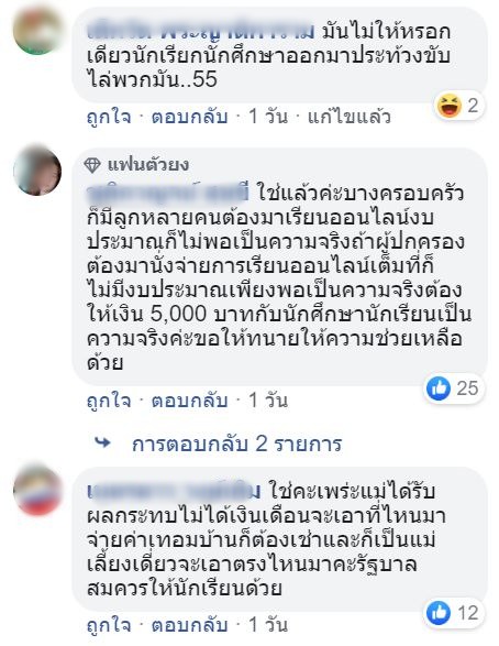 “ใช่คะเพร่ะแม่ได้รับผลกระทบไม่ได้เงินเดือนจะเอาที่ไหนมาจ่ายค่าเทอมบ้านก็ต้องเช่าและก็เป็นแม่เลี้ยงเดี่ยวจะเอาตรงไหนมาคะรัฐบาลสมควรให้นักเรียนด้วย”