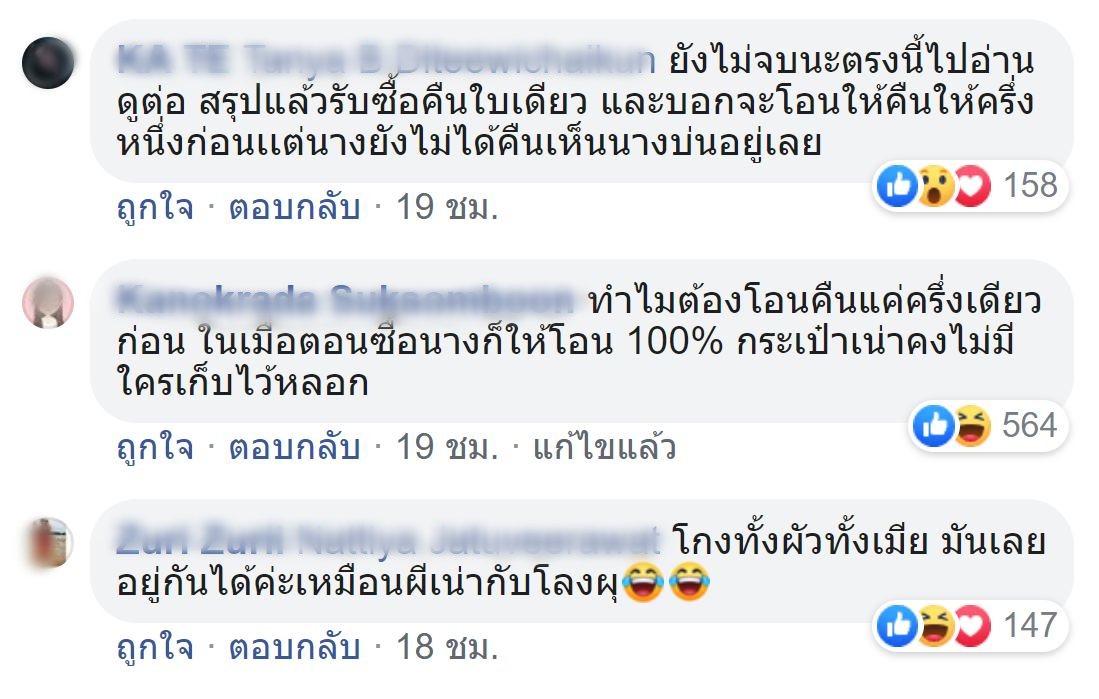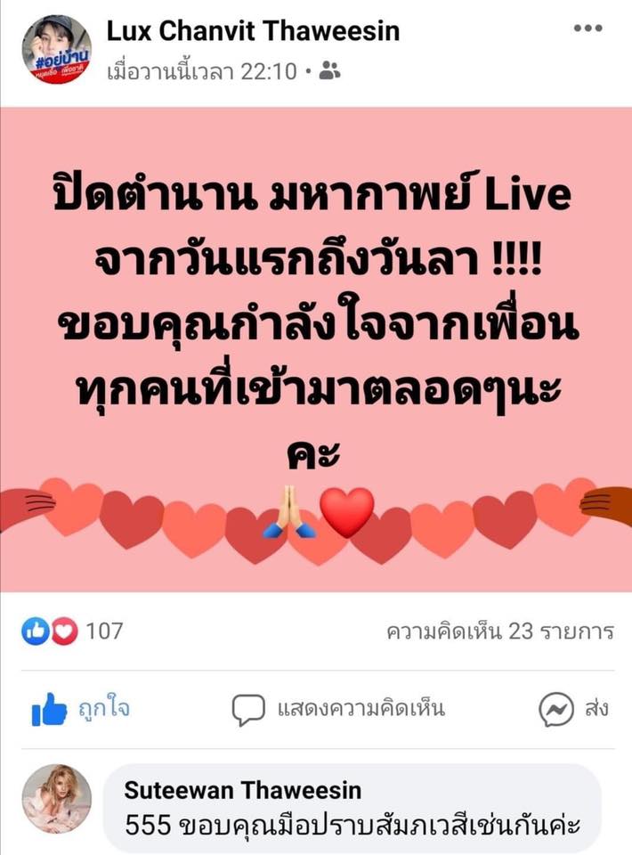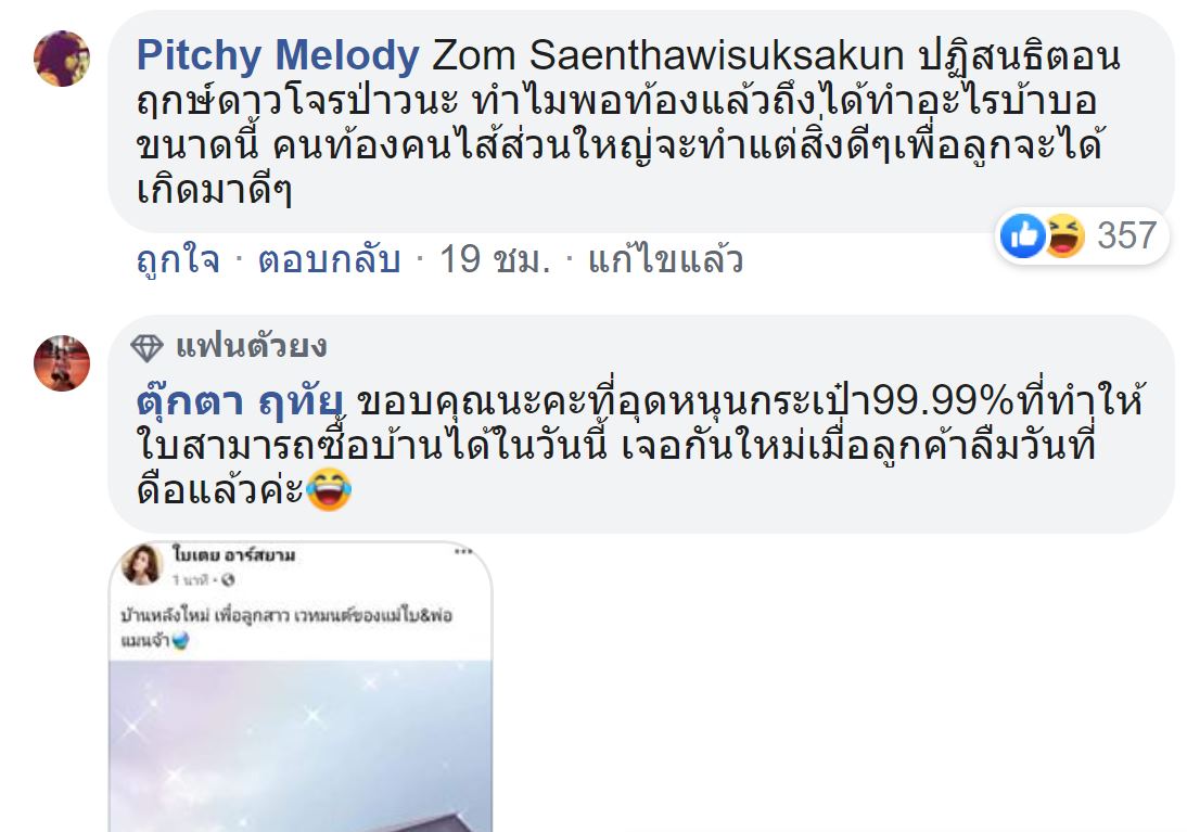 ซึ่งในคอมเมนต์ยังมีโพสต์ต่อ เป็นโพสต์ปิดการขายซึ่งคนที่โพสต์นั่นเป็นน้องของใบเตยนั่นเอง โดยระบุข้อความว่า ปิดตำนานมหากาพย์ LIVE จากวันเเรกถึงวันลา !!!! ขอบคุณกำลังใจจากเพื่อนทุกคนที่เข้ามาตลอดนะคะ หลังจากนั้น คุณเเม่ใบได้เข้ามาคอมเมนนต์ว่า 555 ขอบคุณมือปราบสัมภเวสีเช่นกันค่ะ งานนี้ก็ทำเอาชาวเน็ตเกิดดราม่าขึ้นมา พร้อมทั้งถามกลับว่า ท้องอยู่ทำเเบบนี้ก็ได้หรอ