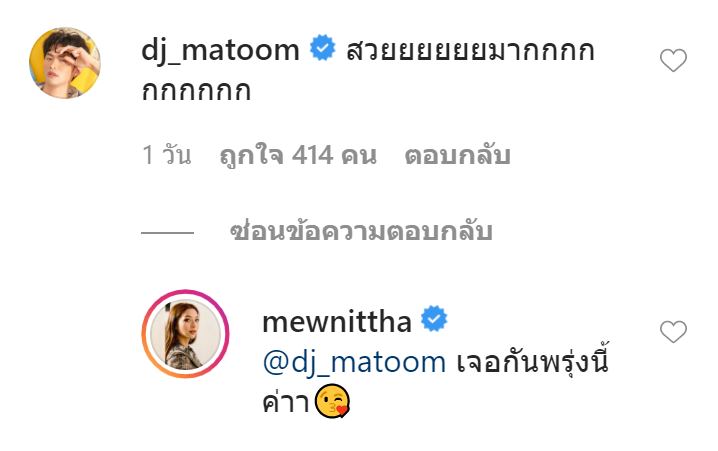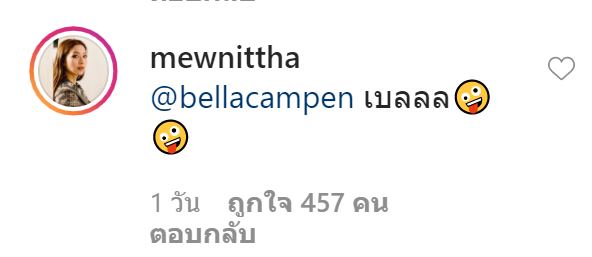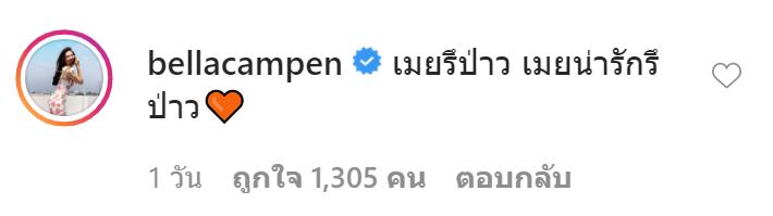 จากนั้นก็มีแฟนละครเข้ามาชมความสวยของเธอกันยกใหญ่เลยทีเดียว และยังมีเพื่อนในวงการอีกด้วยที่เข้ามาชื่นชม และแซวกันเป็นจำนวนมาก ขนาด ดีเจมะตูม ยังเข้ามาคอมเมนท์ชมว่า “สวยยยยยยมากกกกกกกกกก” เช่นเดียวกับนางเอกสาว เบลล่า ราณี ที่เข้ามาคอมเมนท์ว่า “เมยรึป่าว เมยน่ารักรึป่าว🧡”