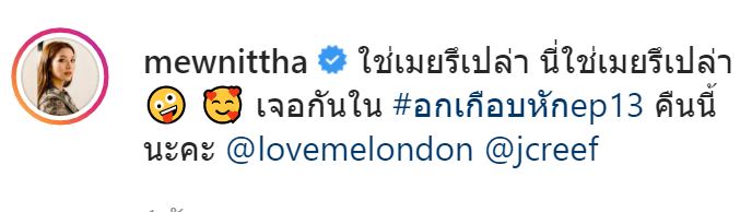 เมื่อวันที่ 2 มิถุนายน ที่ผ่านมา ทางด้าน มิวนิษฐา ได้ออกมาโพสต์ข้อความลงไอจีส่วนตัว พร้อมถ่ายรูปตอนไว้ผมหน้าม้าระบุข้อความว่า “ใช่เมยรึเปล่า นี่ใช่เมยรึเปล่า🤪 🥰 เจอกันใน #อกเกือบหักep13 คืนนี้นะคะ @lovemelondon @jcreef”