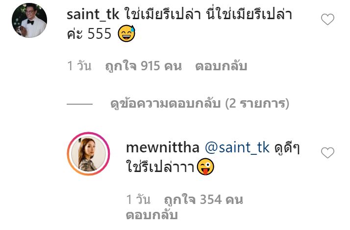 และที่พลาดไม่ได้ก็คงจะเป็นสามีสุดที่รัก ไฮโซเซนต์ ธราภุช คูหาเปรมกิจ ก็ต้องรีบเข้ามา คอมเม้นต์แซวคุณภรรยาด้วยวลีเด็ดพี่สายฟ้าว่า “ใช่เมียรึเปล่า นี่ใช่เมียรึเปล่าค่ะ 555 😅” ซึ่งทำให้ชาวเน็ต แห่แซว Comment ของสามีเพียบ ส่วน มิว ก็ได้ตอบกลับคุณสามีว่า “ดูดีๆใช่รึเปล่าาา😜” บอกเลยว่าเป็นคู่รักที่ดูอารมณ์ดีสุดๆ