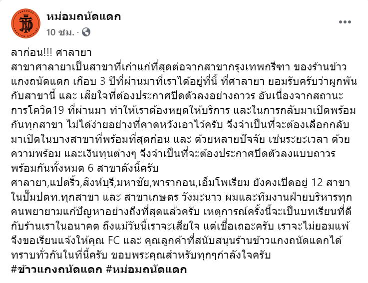 เหตุการณ์ครั้งนี้จะเป็นบทเรียนที่ดีกับร้านเราในอนาคต ถึงแม้วันนี้เราจะเสียใจ แต่เชื่อเถอะครับ เราจะไม่ยอมแพ้ จึงขอเรียนแจ้งให้คุณ FC และ คุณลูกค้าที่สนับสนุนร้านข้าวแกงถนัดแดกได้ทราบทั่วกันในที่นี้ครับ ขอบพระคุณสำหรับทุกๆกำลังใจครับ #ข้าวแกงถนัดแดก #หม่อมถนัดแดก