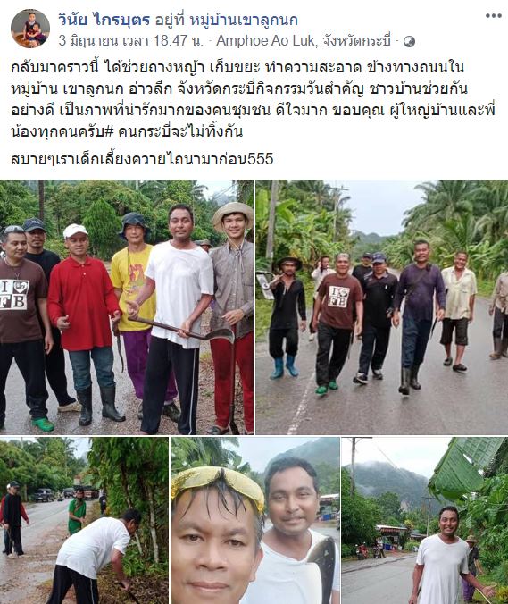 ชาวบ้านช่วยกันอย่างดี เป็นภาพที่น่ารักมากของคนชุมชน ดีใจมาก ขอบคุณ ผู้ใหญ่บ้านและพี่น้องทุกคนครับ #คนกระบี่จะไม่ทิ้งกัน สบายๆเราเด็กเลี้ยงควายไถนามาก่อน555″