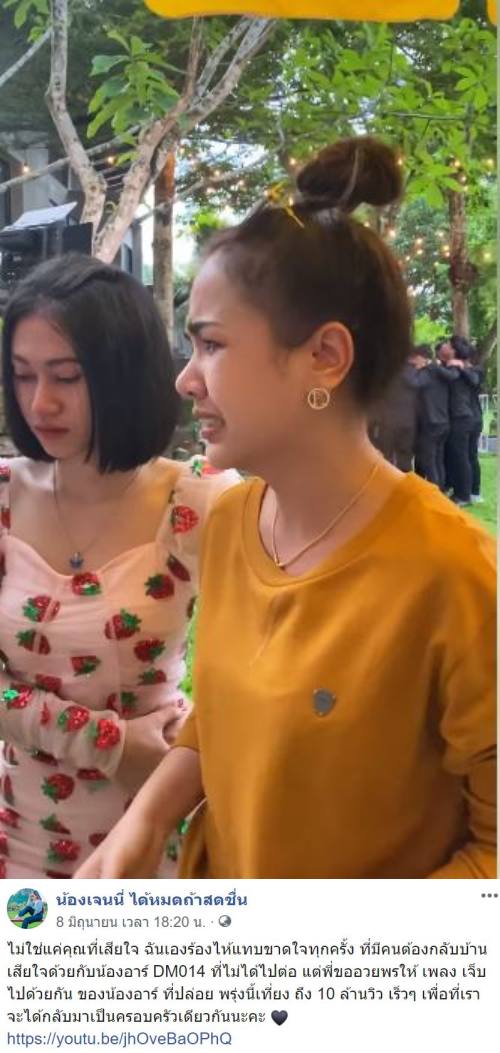 “ไม่ใช่แค่คุณที่เสียใจ ฉันเองร้องไห้แทบขาดใจทุกครั้ง ที่มีคนต้องกลับบ้าน เสียใจด้วยกับน้องอาร์ DM014 ที่ไม่ได้ไปต่อ แต่พี่ขออวยพรให้ เพลง เจ็บไปด้วยกัน ของน้องอาร์ ที่ปล่อย พรุ่งนี้เที่ยง ถึง 10 ล้านวิว เร็วๆ เพื่อที่เราจะได้กลับมาเป็นครอบครัวเดียวกันนะคะ”
