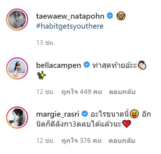 และในขณะเดียวกัน ก็มีคอมเม้นท์จากคุณแม่ลูกแฝด นางเอกสาว มาร์กี้ ราศรี ที่โผล่เข้ามาคอมเม้นหลังเห็นคลิปเช่นกัน ด้วยข้อความว่า อะไรขนาดนี้ อีกนิดก็ตีลังกาสามตลบได้แล้วนะ