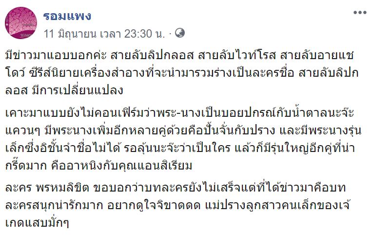 ต่อมาทางด้าน นักเขียนมากฝีมือ รอมแพง ก็ได้ออกมาเคลื่อนไหวผ่านแฟนเพจ โดยได้เล่ารายละเอียดสุดเซอร์ไพรส์ บุพเพสันนิวาส นวนิยายชื่อดังของตัวเอง หลังถูกไปสร้างเป็นละคร แล้วโด่งดังมากๆ  ที่ตอนนี้เตรียมจะนำไปสร้างเป็นเวอร์ชั่นภาพยนตร์ในเร็ววัน