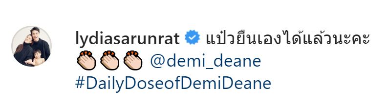 อย่างล่าสุด 13 มิถุนายน 2563 ทาง IG ของแม่ลิเดียก็ได้มีการออกมาอัพเดทคลิปพร้อมกับภาพ พัฒนาการล่าสุดของน้องเดมี่ ที่ตอนนี้สาวน้อยตาแป๋ว สามารถยืนเองได้แล้ว ซึ่งในคลิปจะเห็นได้ว่า หลังจากที่น้องเดมี่ยืนเองได้ ก็ตบมือให้ตัวเองใหญ่เลย แถมยังยิ้มหวานให้กล้อง ด้วยท่าทางที่ดีใจสุดๆ