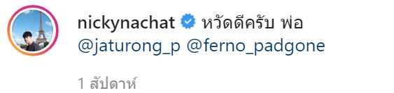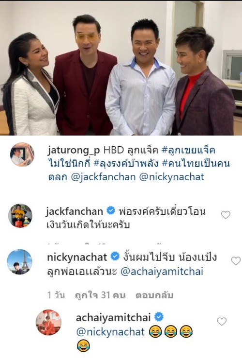 และเมื่อไม่นานมานี้จตุรงค์ได้โพสต์คลิปอวยพรวันเกิดแจ็คแฟนฉัน ซึ่งหนึ่งในนั้นมีเอไชยาร่วมในคลิปด้วย ซึ่งจะทดลองได้เขียนแคปชั่นประมาณว่า  happy birthday ลูกเขยแจ็ค พร้อมใส่แฮชแท็กว่าไม่ใช่นิกกี้ งานนี้ทำเอาเจ้าตัวอยู่เฉยไม่ไหวเข้าไปคอมเม้นใต้คลิป ระบุว่า จะไปจีบน้องแป้งลูกพ่อเอไชยานั่นเอง จากนั้นพระเอกก็เข้ามาคอมเม้นด้วยรูป Emoji หัวเราะ