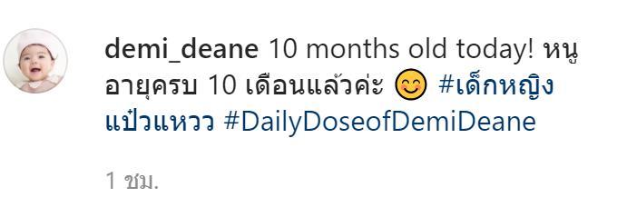 โดยทาง อินสตาแกรม ของน้องเดมี่ที่แม่ลิเดียเป็นคนเล่นได้มีการโพสต์ภาพพร้อมกับระบุแคปชั่นว่า 10 months old today! หนูอายุครบ 10 เดือนแล้วค่ะ 😊 ทำเอาบรรดาแฟนคลับที่หลงรักน้องเดมี่เข้ามาคอมเม้นกันเพียบต่างก็พากันหลงใหลในความน่ารักสดใส