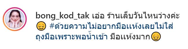 อย่างล่าสุดใน IG ของสาวตั๊ก ก็ได้ออกมาเผยภาพเล็บของเธอที่ดูแล้วดำมาก เนื่องจากเปื้อนดินที่เธอลงมือปลูกผัก พร้อมกับระบุข้อความว่า “เอ่อ ร้านเล็บวันไหนว่างค่ะ #ด้วยความไม่อยากมือเเห้งเลยไม่ใส่ถุงมือเพราะพอน้ำเข้า มือเเห้งมาก”